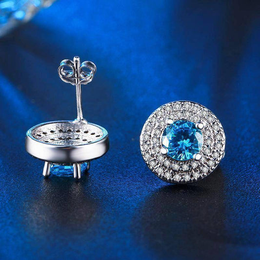 Tropical Blue CZ Double Halo 14K White Gold Plated Stud Earrings for Woman