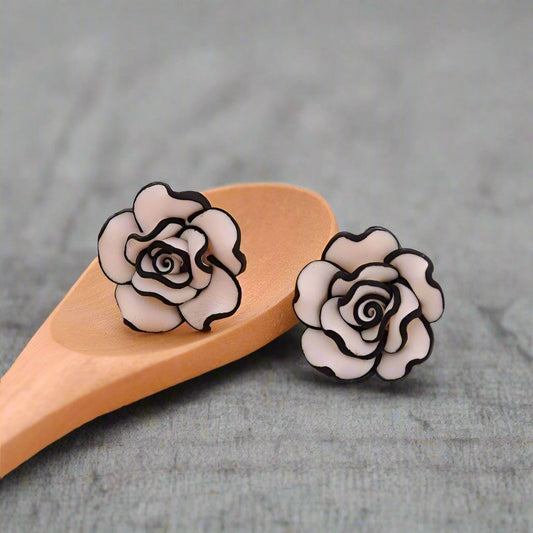 Black and White Rose Hand Crafted Clay Stud Earrings for Women 316 Steel Hypoallergenic
