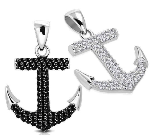 CZ Encrusted Mariner's Anchor Stainless Steel Pendant Necklace in Black or White CZ
