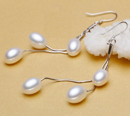 White Triple Genuine Freshwater Pearl Sterling Silver Tassel Earrings for Women