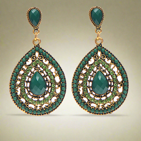 Boho Bead and Crystal Filigree Drop Earrings for Women – Antique Gold Patina Dangle Earrings, Elegant Resin & Crystal Jewelry Gift