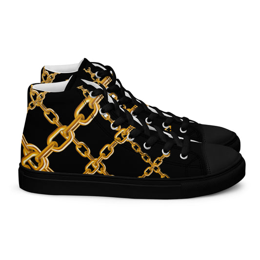 Steampunk Elegance: Black & Gold High Top Sneakers for Men - Unique Streetwear, Designer Canvas, Luxury Festival Footwear with Stylish Art Deco Chain Links