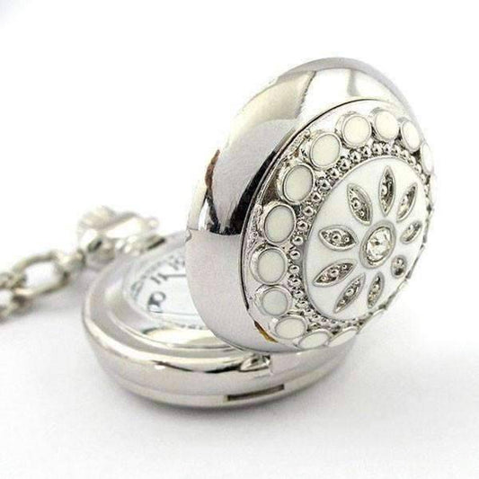White Pearl Flower Vintage Style Mini Pocket Watch Necklace For Woman