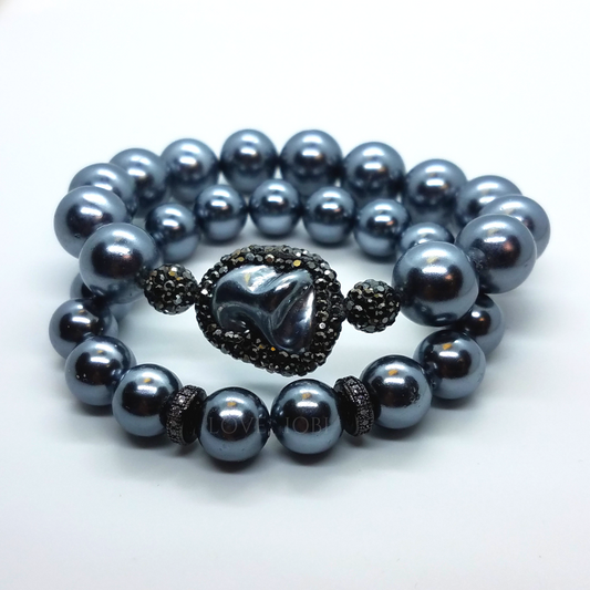 Black Shell Pearl and Hematite Stretch Bracelet Set for Woman