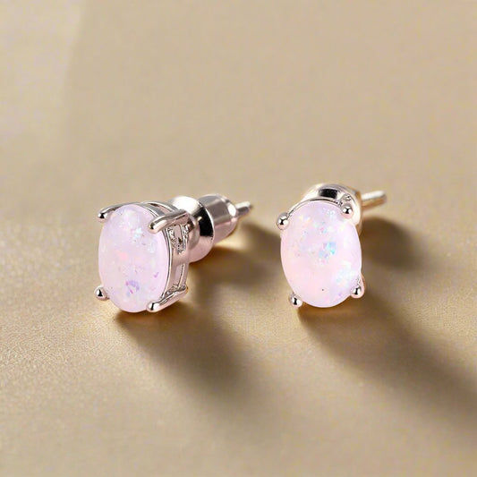 White Simulated Opal Oval Solitaire On 14K White Gold Plated Stud Earrings