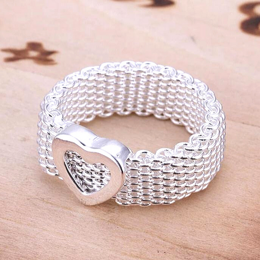 Heart Silky Chains Silver Mesh Ring for Women Casual or Dressy