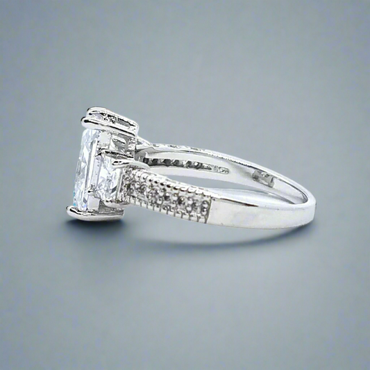 14K White Gold Plated 3.1 TCW Radiant Cut Three Stone Simulated Diamond Ring for Women – Perfect for Special Occasions