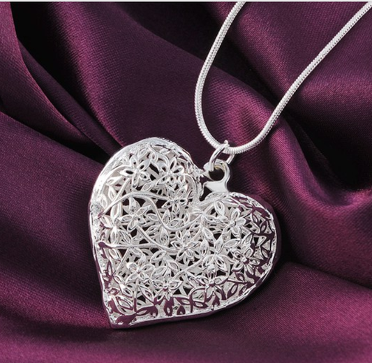 Flowering Scroll Design Puffed Heart Silver Necklace for Woman