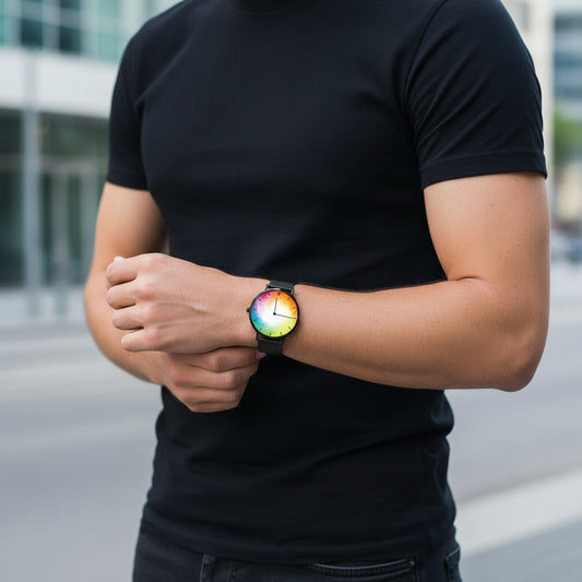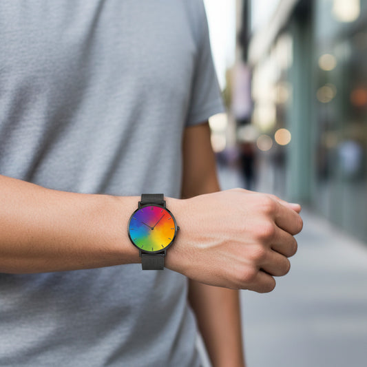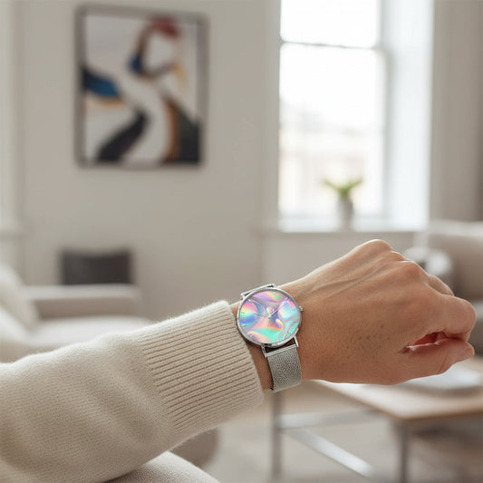 Fashion Ultra-Thin Stainless Steel Quartz Watch with Rainbow Watercolor Design