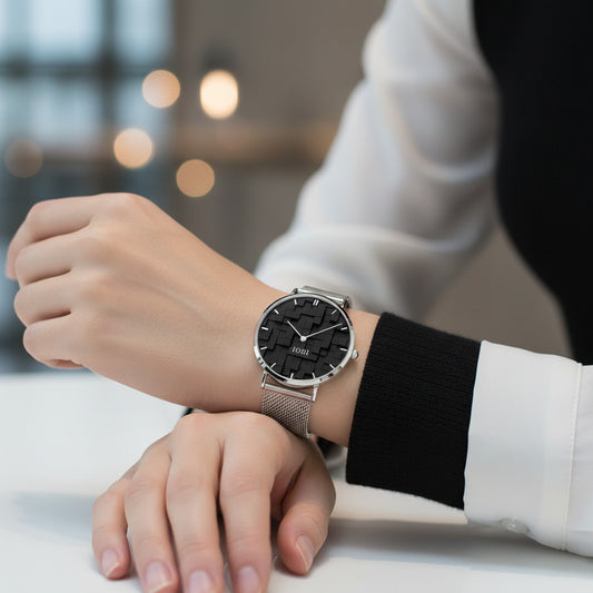 Fashion Ultra-Thin Stainless Steel Quartz Watch with Black Cubes Design