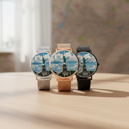 Fashion Ultra-Thin Stainless Steel Quartz Watch – Statue of Liberty New York Skyline Dial, Unisex, Elegant & Lightweight