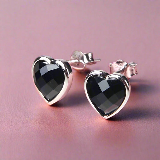 Faceted Genuine Black Agate Heart Stud Earrings for Women – Sparkling Silver Plated Design