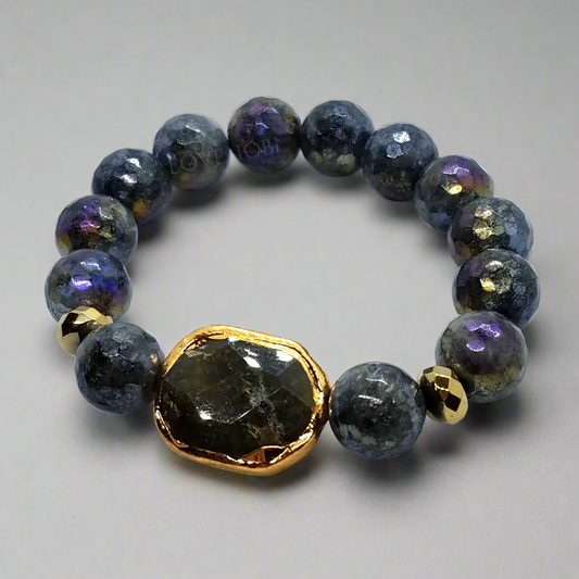 Natural Labradorite Briolette Stretch Bead Bracelet for Women with Gold Edging