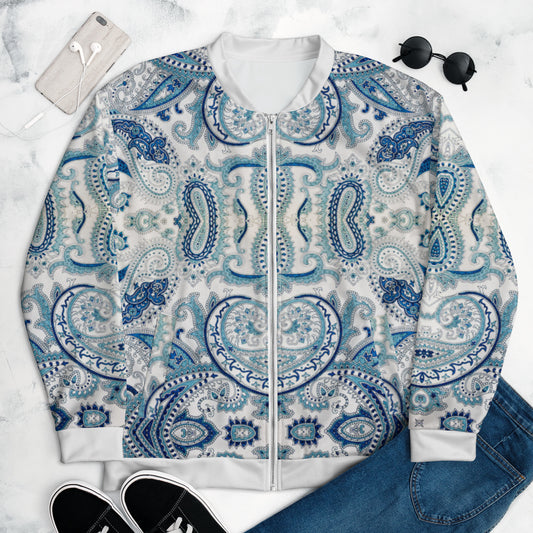 Women Bomber Jacket With Pockets Zipper Cool White Blue Paisley Design by IOBI Original Apparel
