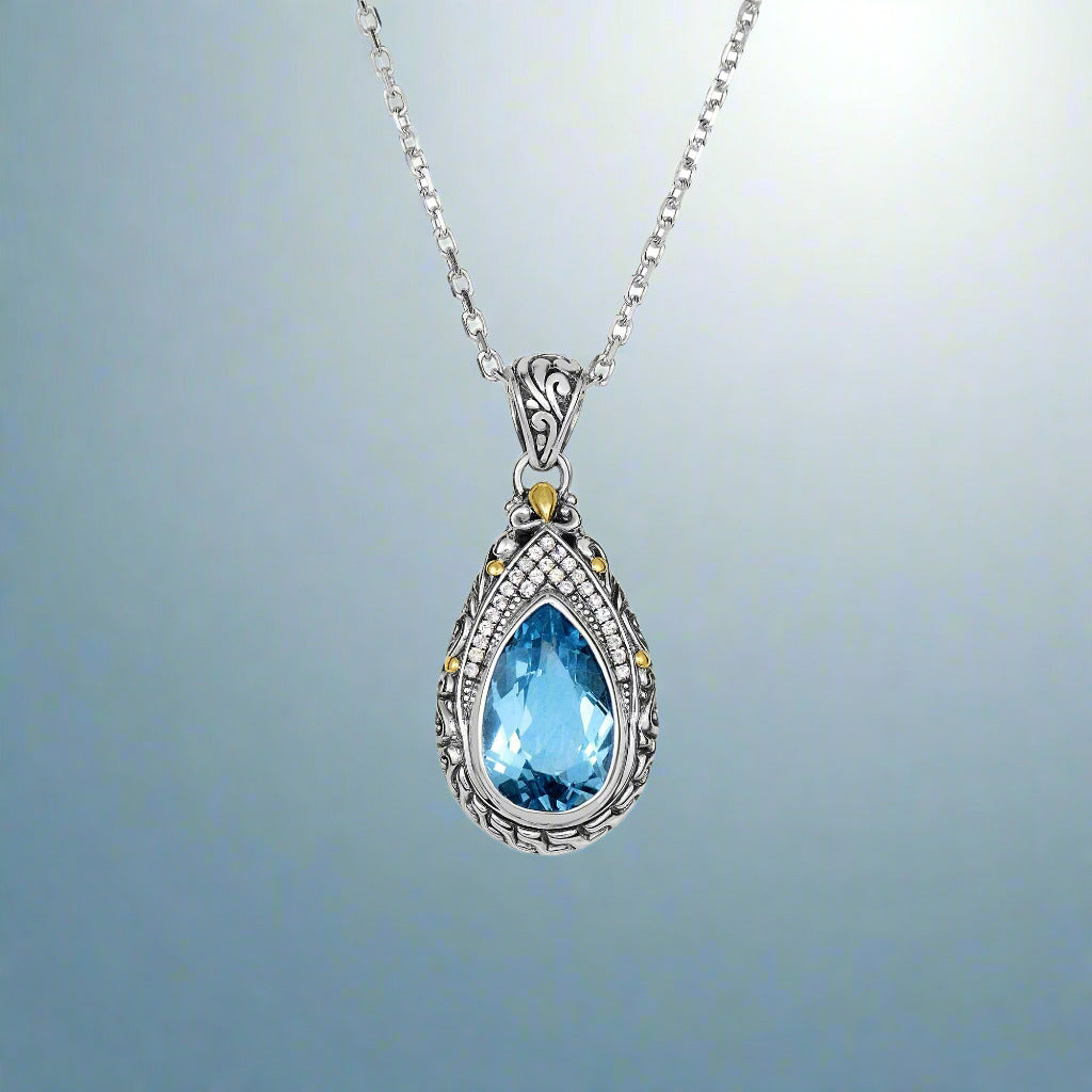 18Kt Yellow Gold+Silver with Oxidized Finish Shiny 34X16mm White Sapphire+Blue Topaz Teardrop Byzantine Pendant On Silver 18 inches 1.9mm Cable Chain Lobste