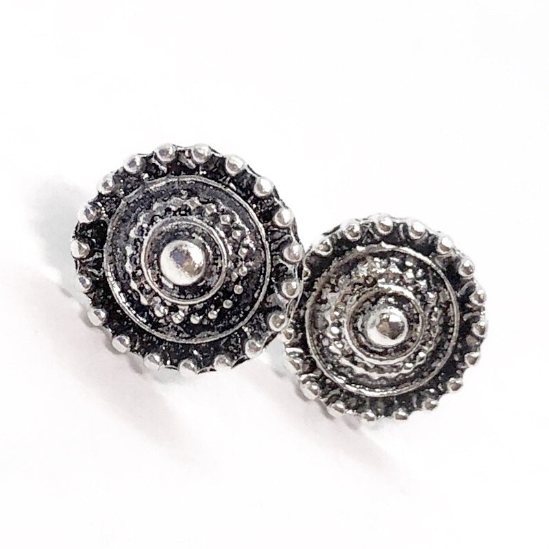 Elegant and vintage with a little boho flair. This round button stud is a textural delight with multiple concentric circles of patina and silver. Sure to get compliments.