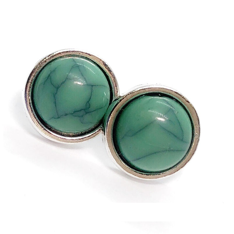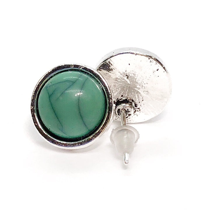 Simple boho flair. A round resin cabochon with turquoise veining is bezel set inside of a sleek silver circle. The perfect pop of color for a boho chic ensemble. Sure to get compliments.