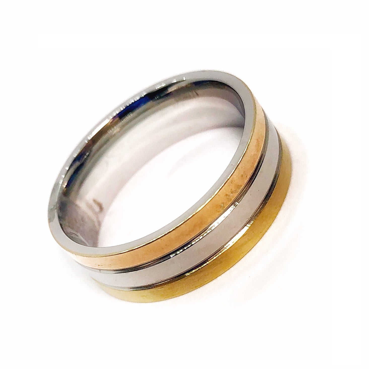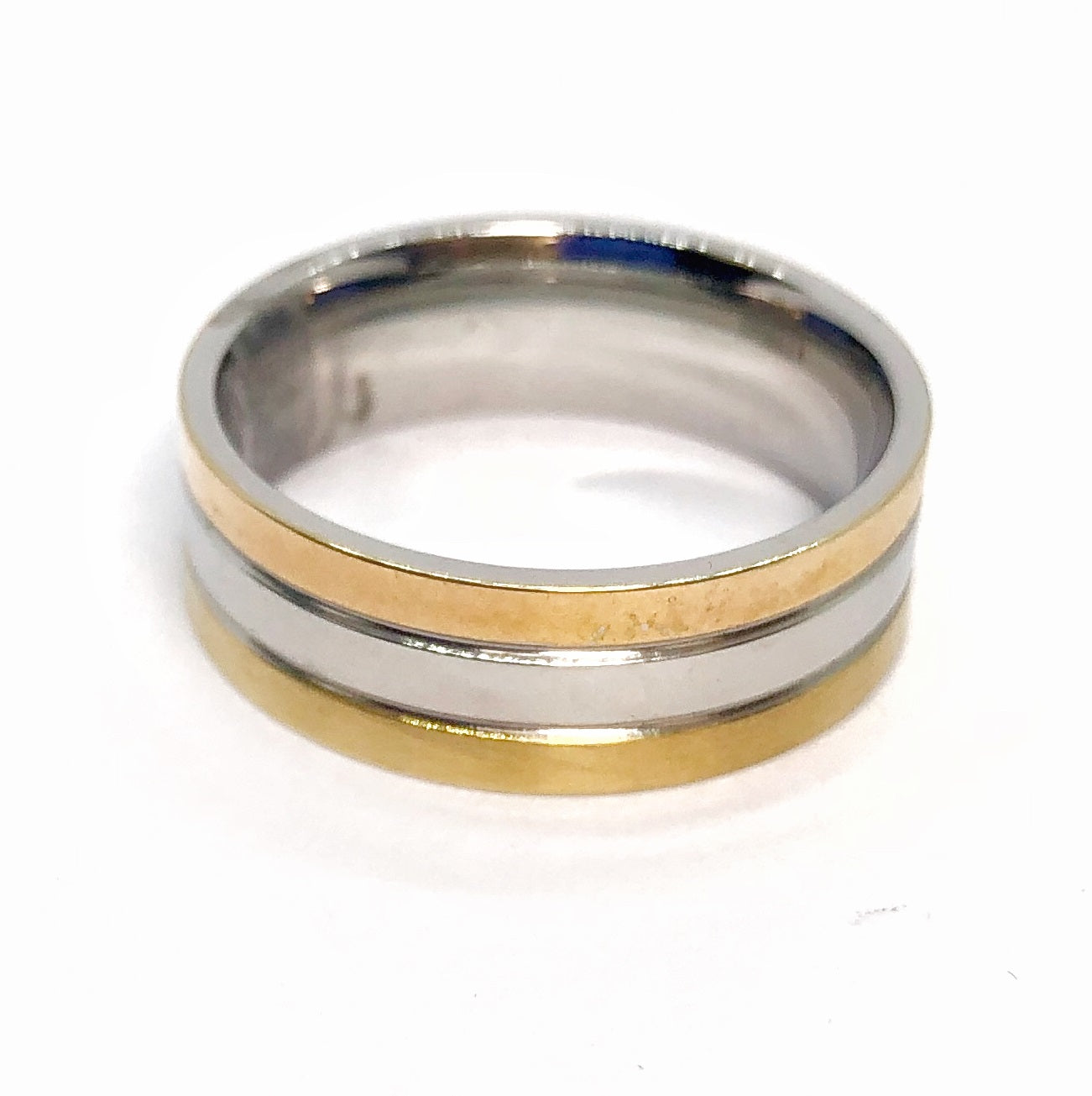 Three wide lines of polished stainless steel create a unique and interesting design. The gold plating adds contrast to the polished lines of this 316 Stainless Steel band. Stainless Steel will not tarnish and is hypo-allergenic.