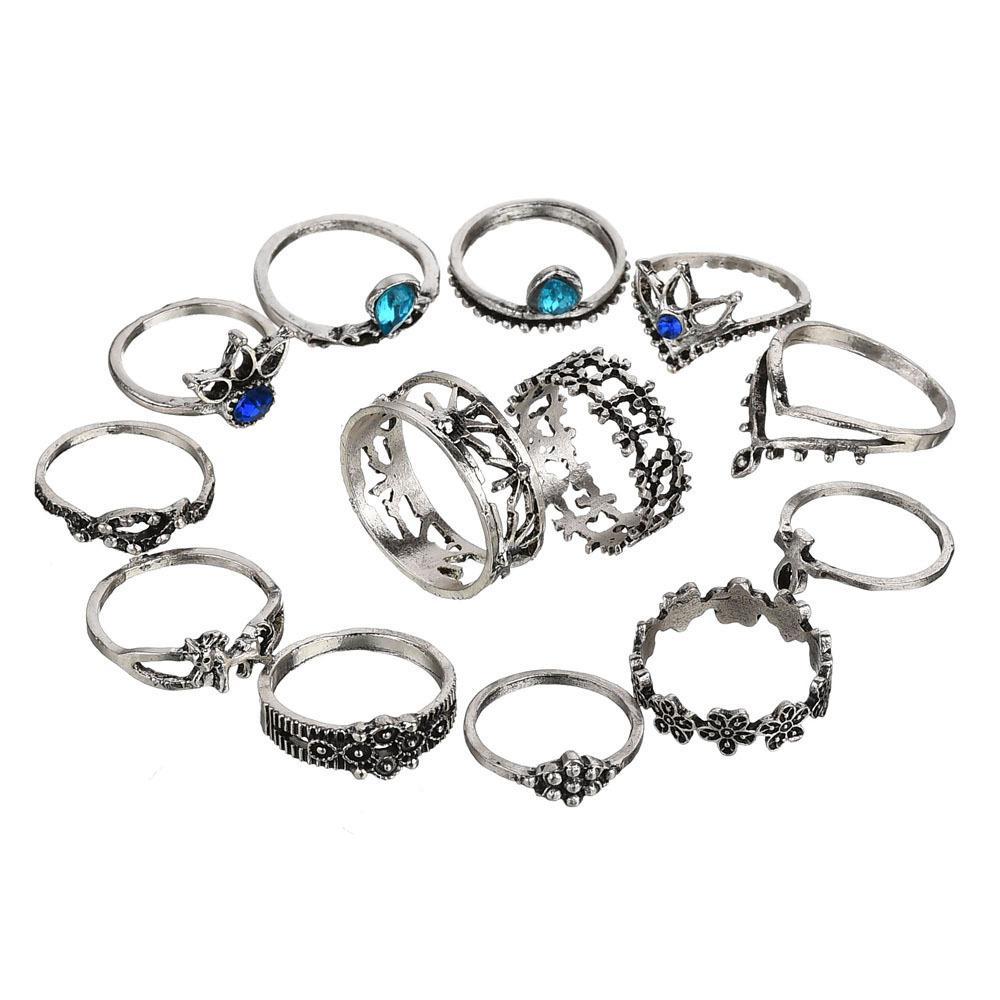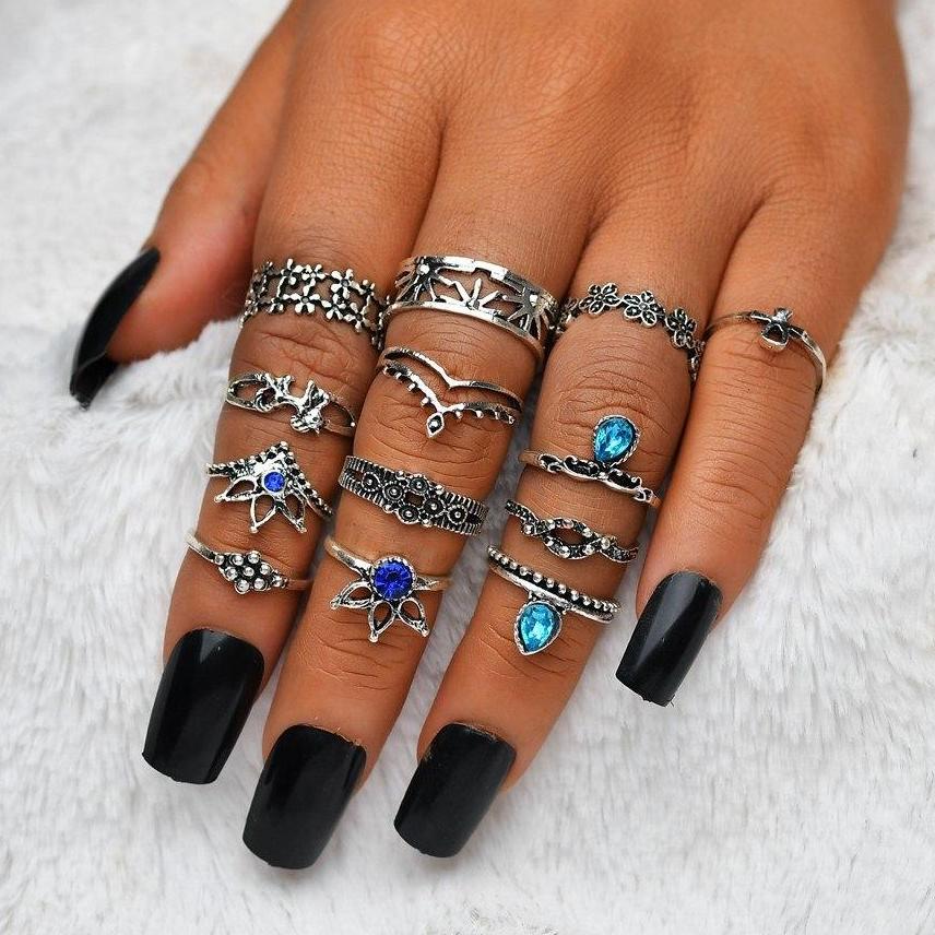 The hottest new jewelry trend is coordinating rings to wear on every finger! Various sizes to fit from the standard ring style all the way to the top of the fingers. An assortment of bands featuring floral motifs and animals is accented by bright aqua and blue jewels. Wear them all together or alone. Fantastic value for 13 rings!