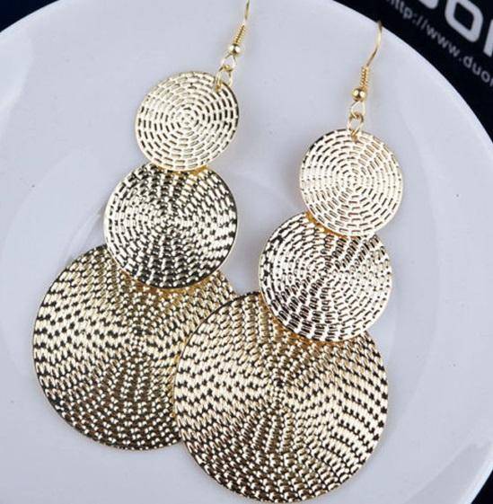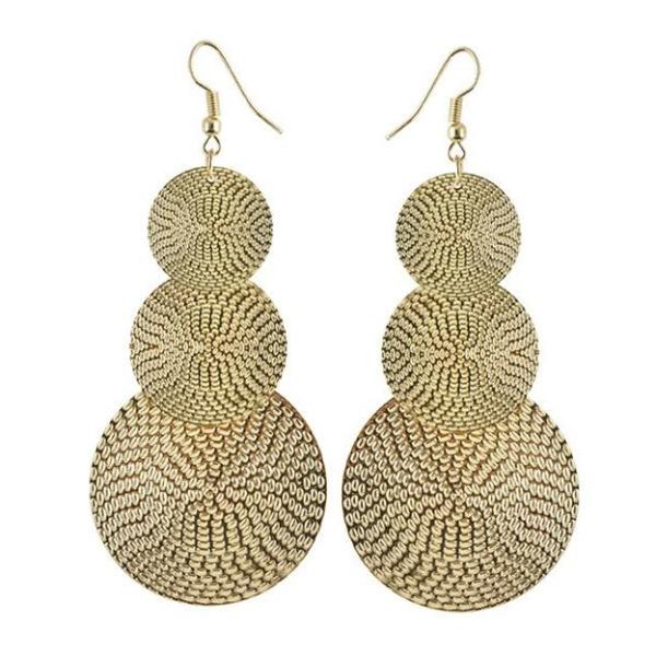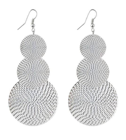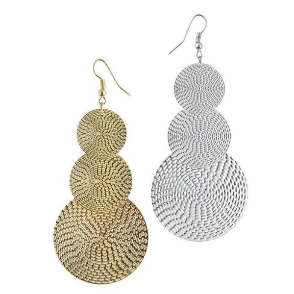 These beautiful earrings feature three round medallions with a stamped basket weave pattern. Bold and shiny, yet lightweight for comfort. Available in silver or gold