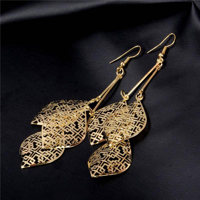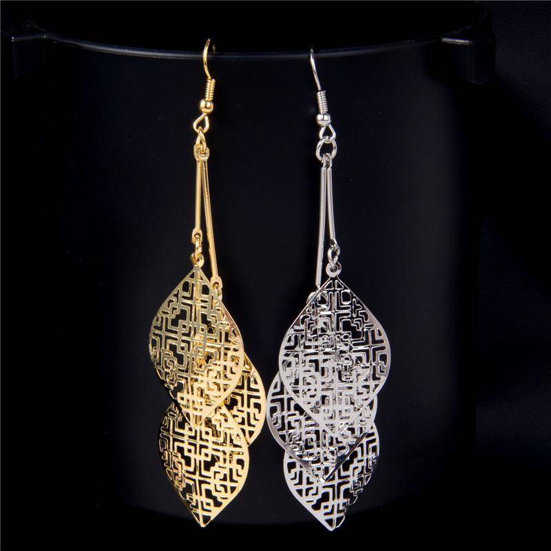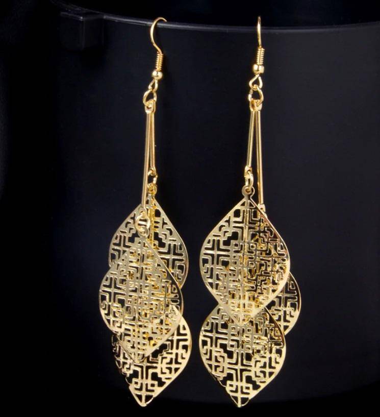 These beautiful earrings feature three leaf shaped medallions with a stamped batik pattern. Bold and shiny, yet lightweight for comfort. Available in silver or gold