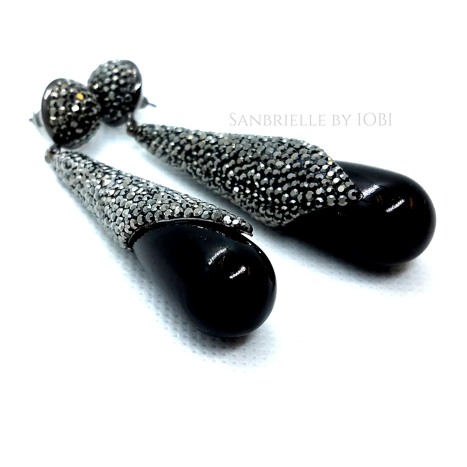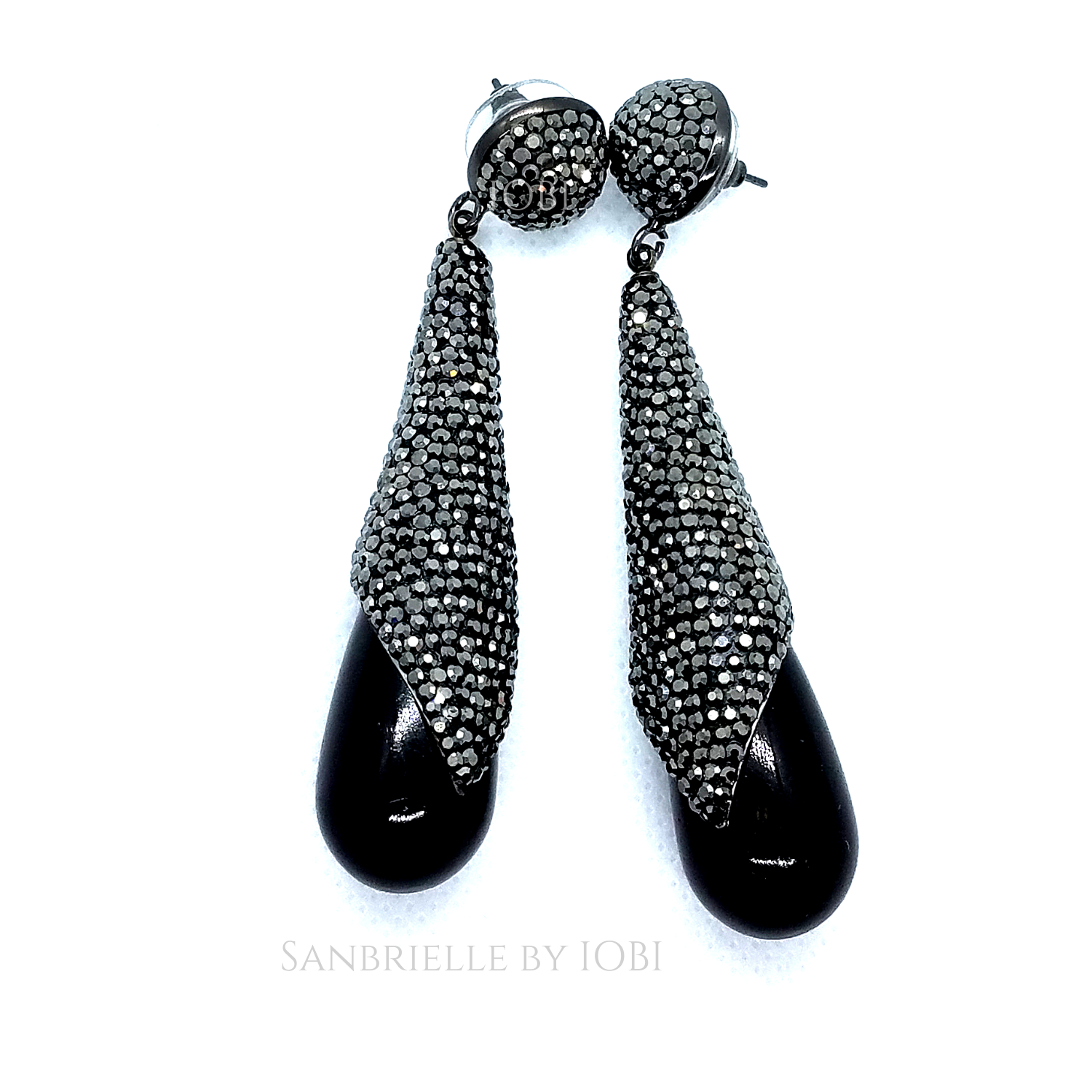 The color black is mysterious, associated with power and elegance. Multi-faceted black crystals are draped around an intense black raindrop. The crystals create incredible sparkle against the highly polished resin. Graceful movement adds texture and interest to these dramatic earrings. Each is one of a kind and no two are exactly the same. An incredibly unique jewel for the discerning collector.