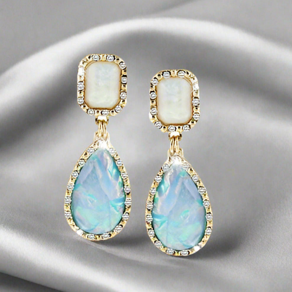 Get ready to shine with these stunning pear-shaped cabochon earrings! 🌈 Each opalescent green cabochon sparkles with specks of gold and pink, creating a dazzling play of colors. Surrounded by shimmering rhinestones and set in a luxurious gold-tone finish, these earrings are truly a showstopper. 💎