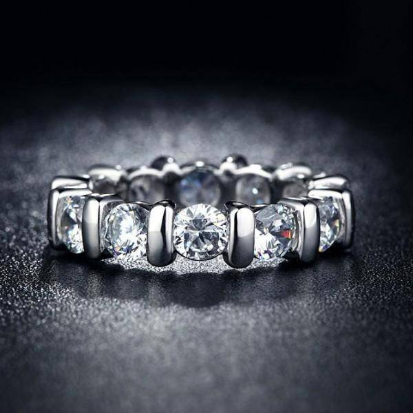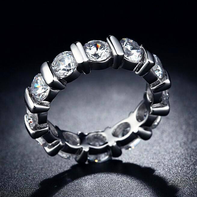 This contemporary eternity ring absolutely dazzles! Eleven shimmering 5mm cubic zirconias are tension set between highly polished 14K White Gold plated bars. This band makes a statement all alone and would be a perfect companion wedding band to an heirloom diamond solitaire ring. Not for the faint of heart, this ring is IMPRESSIVE!