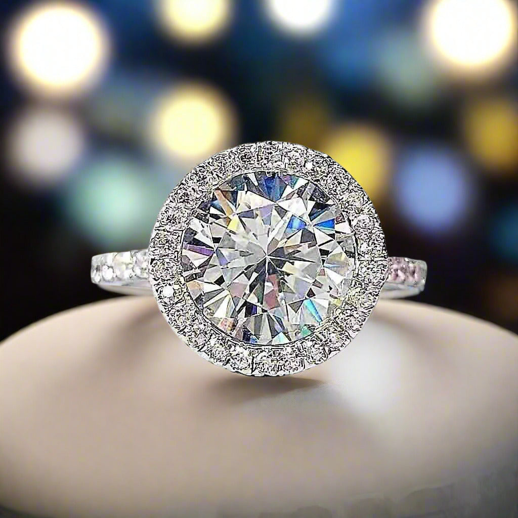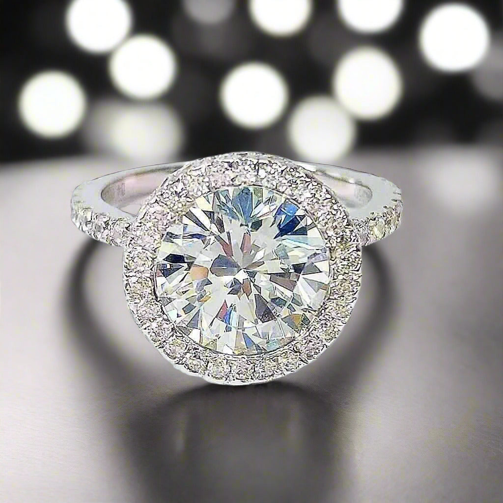 Prepare to captivate with the stunning allure of the Evangeline Ring. This breathtaking 4-carat OB Simulated Diamond centerpiece dazzles with unmatched brilliance, boasting an IF Clarity rating and a flawless D-E Color grade. Expertly cut and polished, its exquisite facets radiate a brilliance and fire that rivals natural diamonds.