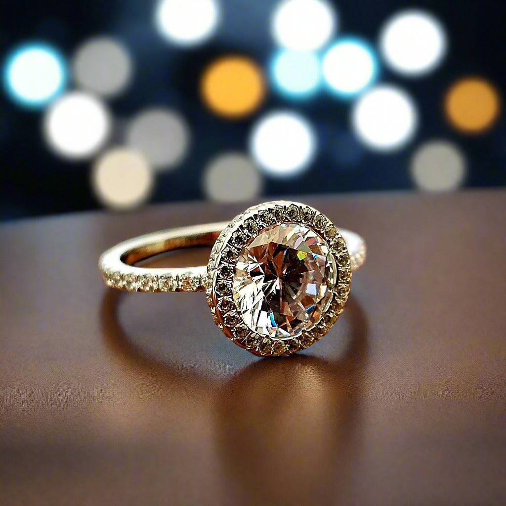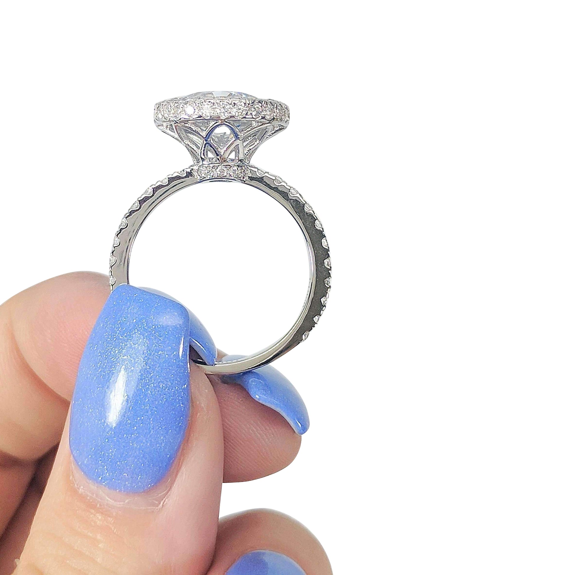The intricate design of the Evangeline ring is nothing short of enchanting. A mesmerizing round stone takes center stage, surrounded by a glowing halo of petite pavé-set stones. The elegant open crown design reveals the full beauty of the solitaire from every angle. The band is delicately adorned with sparkling white stones extending ¾ of the way down, while a surprise diamond, flush-mounted at the bottom, adds a touch of unexpected charm.