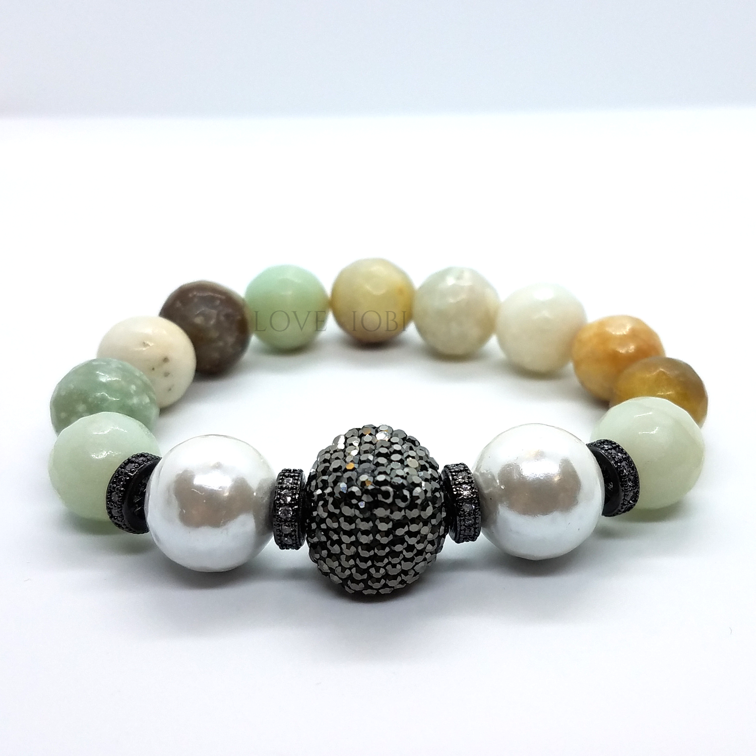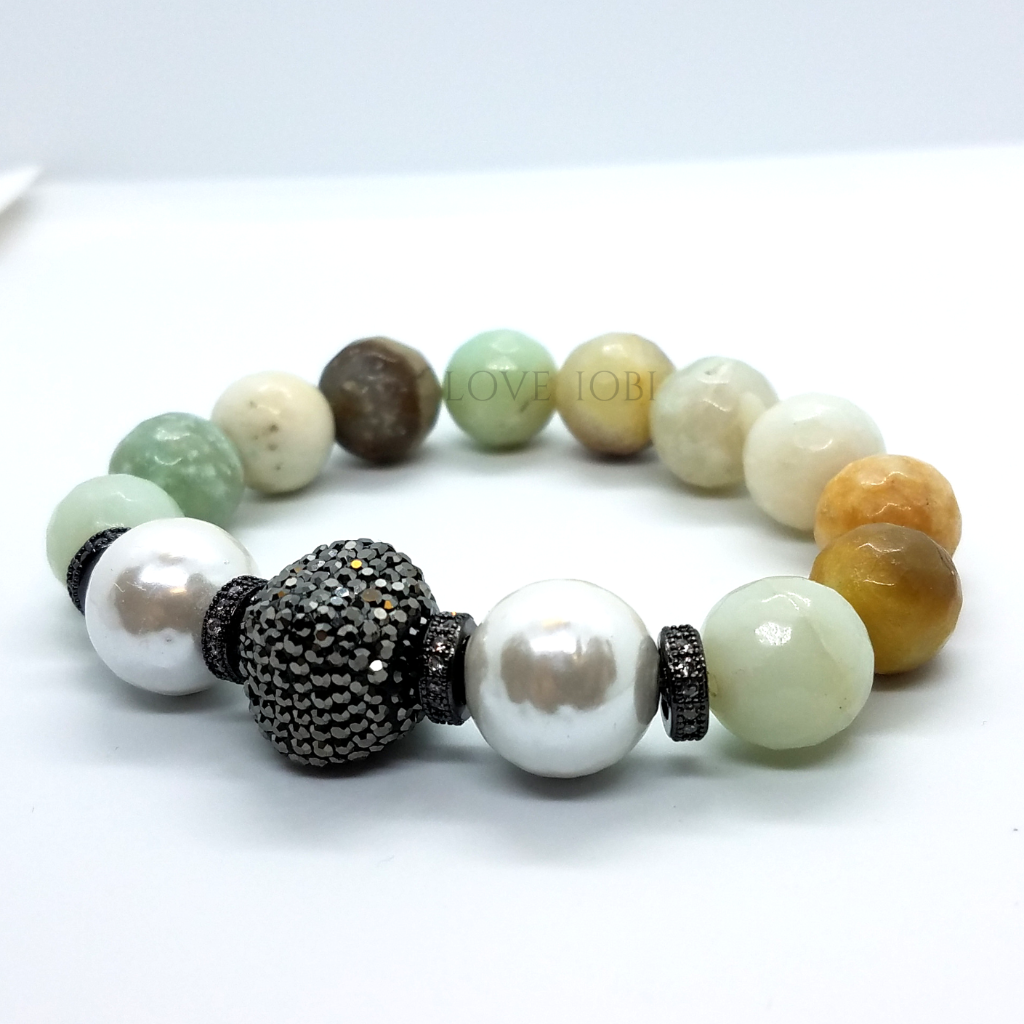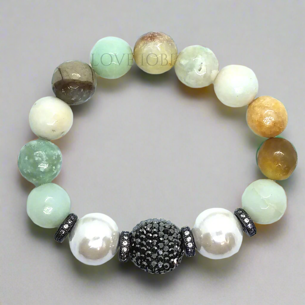 Amazonite named for the Amazon River of South America is a translucent to opaque gemstone with colors ranging from light to deep green. The individual beads are micro faceted to create incredible shine on the surface of the gemstones. A hematite encrusted puffed square bead is the centerpiece with coordinating gunmetal spacers. Large shell pearls add a pop of contrast to the creamy stones. Strung on a strong stretch cord it is smooth and comfortable. Genuine gemstones are created deep within the earth. Each is hand cut and faceted to showcase the rich colors. Each is one of a kind and no two are exactly the same. An incredibly unique jewel for the discerning collector.