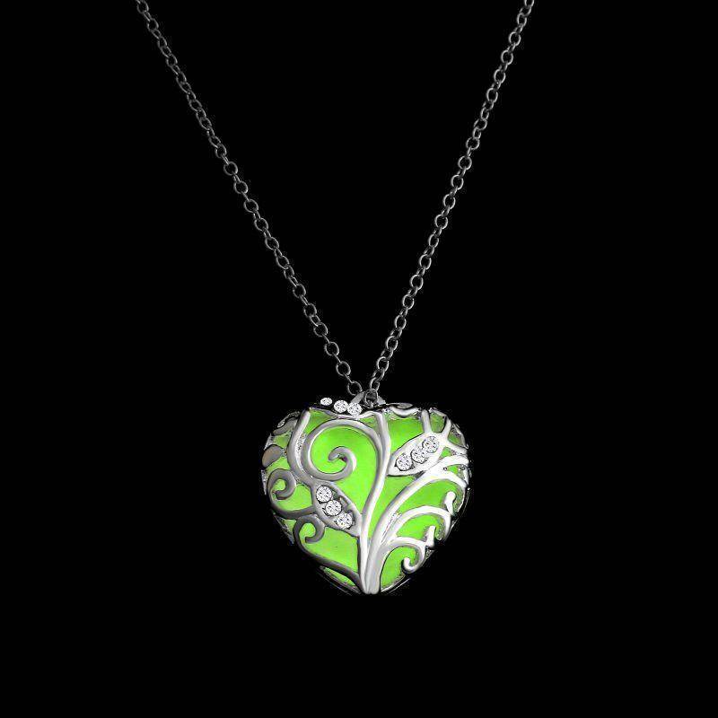 As if plucked from a fairy tale, this enchanting heart pendant will surely leave you spellbound. Beautiful in its pearl white colored state this pendant holds a secret. In darkness it glows in lustrous blue and aqua tones.The magical heart appears to be captured inside of an intricate silver filigree forest of swirling vines accented with crystal encrusted leaves. The pendant glows in darkness after being charged by natural or artificial light. The luminous blue will fade back to white but will recharge in light, over and over again.