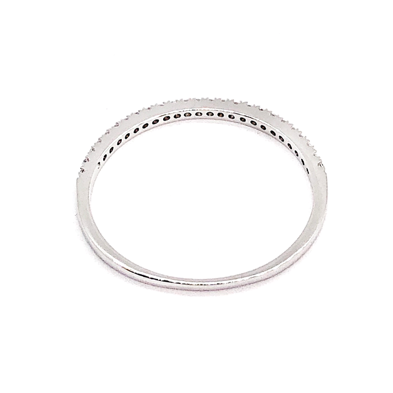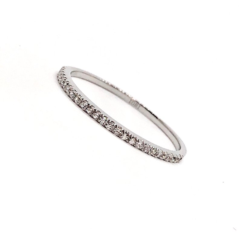 Intricately crafted, this petite pavé diamond band features diamonds along the top half of the ring to create a fine line of brilliance. A subtle but gleaming addition to a stack collection of rings or an heirloom solitaire. Using only the most premium quality, highly polished, Platinum Plating for the setting and band, the effect is a beam of pure white light.