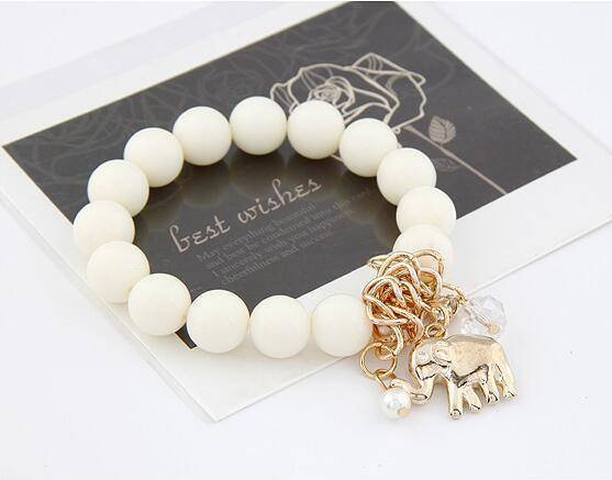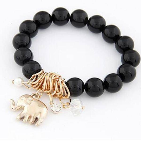 Adorable, playful, and spiritual. This beaded bracelet features a beautiful cluster of gold plated charms and crystals, including a lovely high-detailed elephant with its trunk facing up as a symbol of good luck. The beads are smooth and on an elastic band making it comfortable to put on and wear all day.