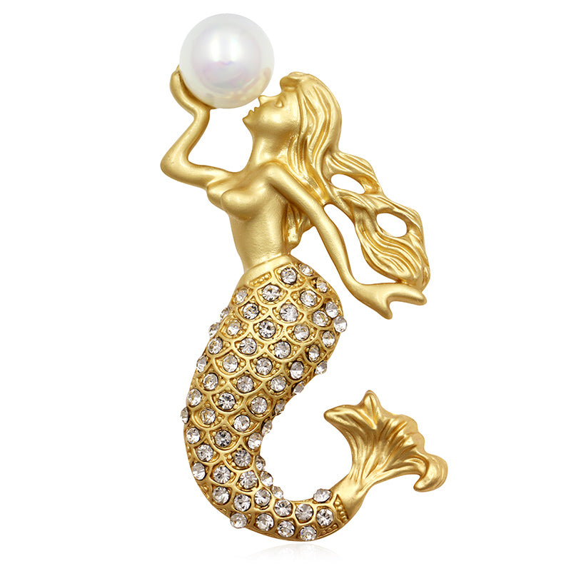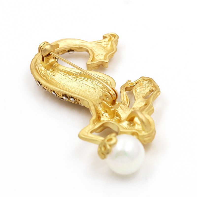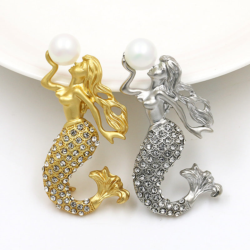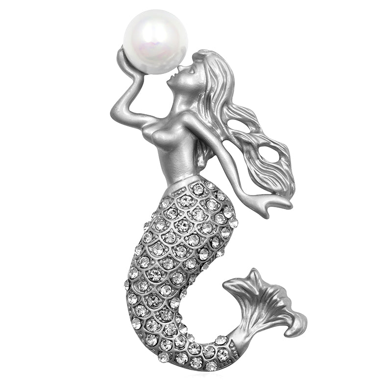 The shiny metal mermaid features sparkling crystals set along the scales of the tail. She carries a large pearl bead as if rising to the surface. It can be pinned to a chain to wear as a necklace.