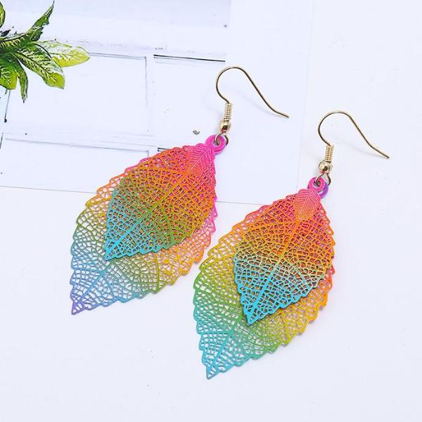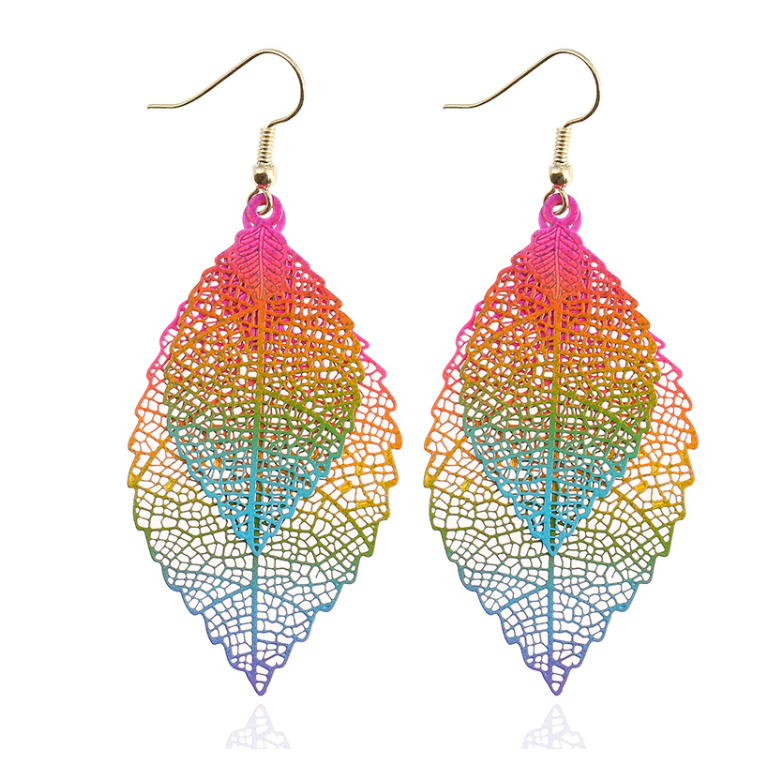 These unusual earrings feature two dangling leaves in a metal mesh material. Bold and shiny, yet lightweight for comfort. A colorful addition to everyday fashions.