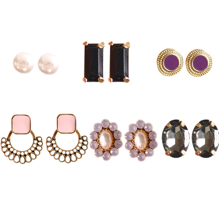 Make accessorizing easy with a complete collection of stud earrings. Go from day to night with everything from basic pearl bead studs and unique jacket backs to glamorous black rhinestones. Simple, sweet and elegant all in one six-piece collection.