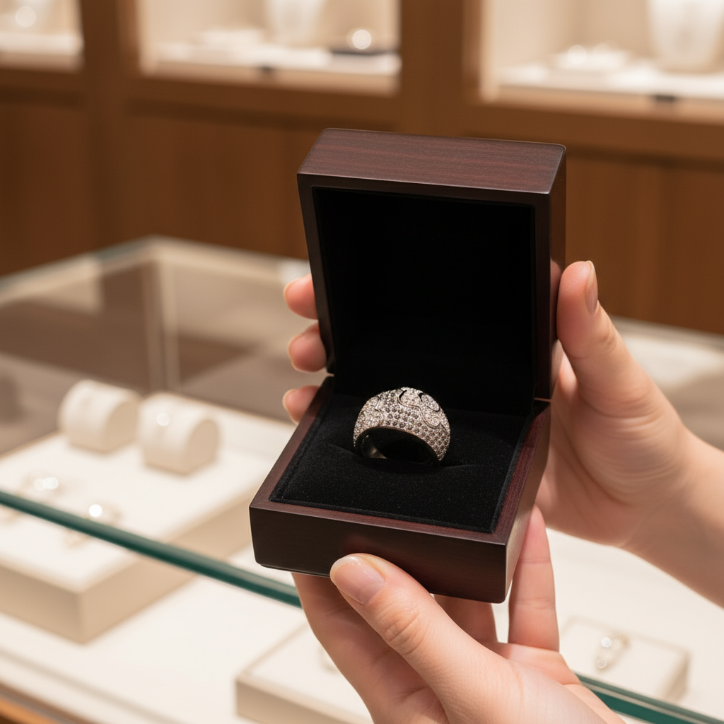 Like walking through a garden by moonlight this spectacular dome ring plays with contrast of dark and light. White micro pavé cubic zirconia stones are set in individually cast in flowing flower petals. All set against a shimmering background of more silvery-gray cubic zirconia stones. The bright white is carried throughout the band with three times platinum. Incredible shine yet delicately sweet.