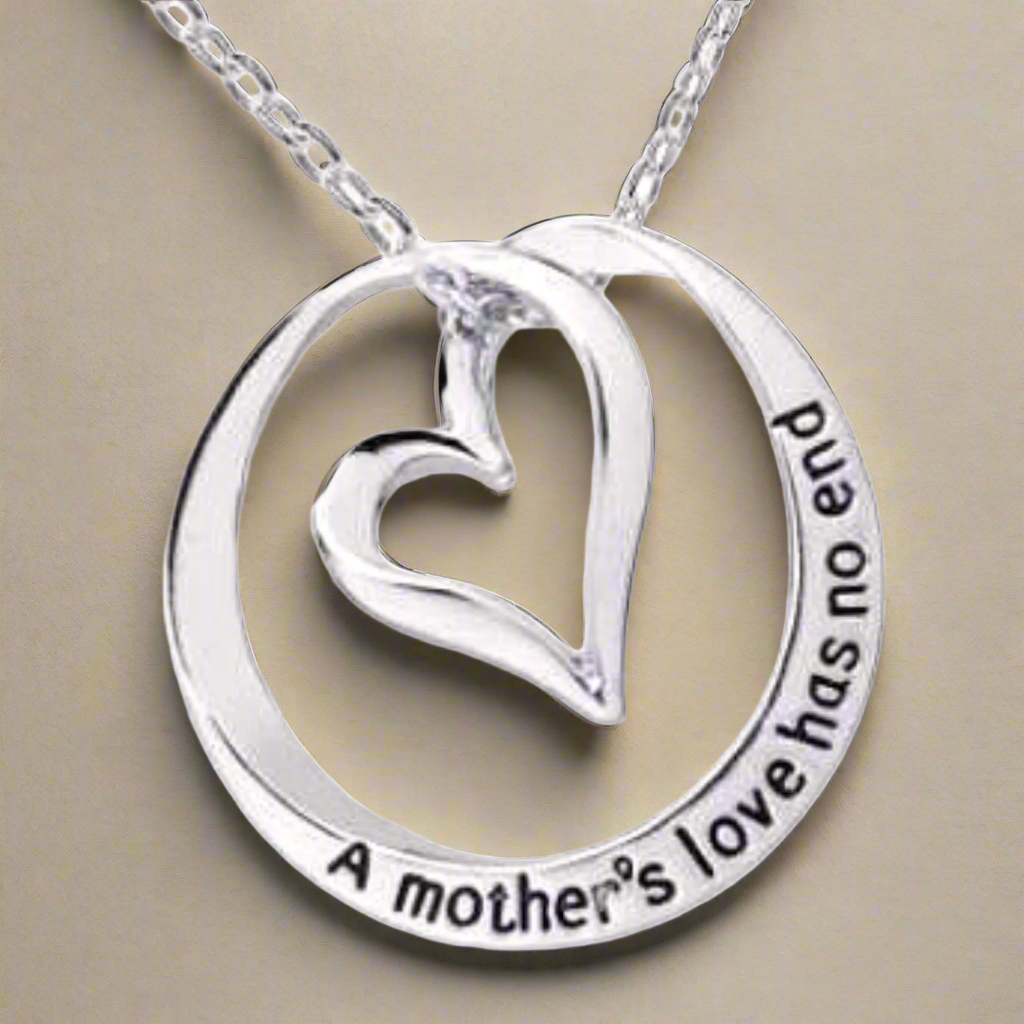 Tell Mom she's loved with this artisan style, hand stamped charm necklace. "A Mother's Love Has No End" is hand embossed on the front of the shiny, round pendant that twists into a heart with no end. Includes an 18 inch chain with lobster claw clasp.
