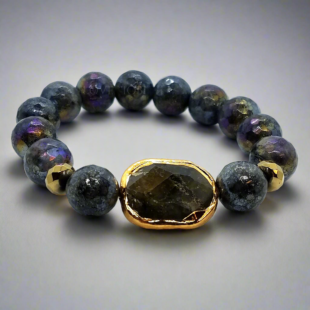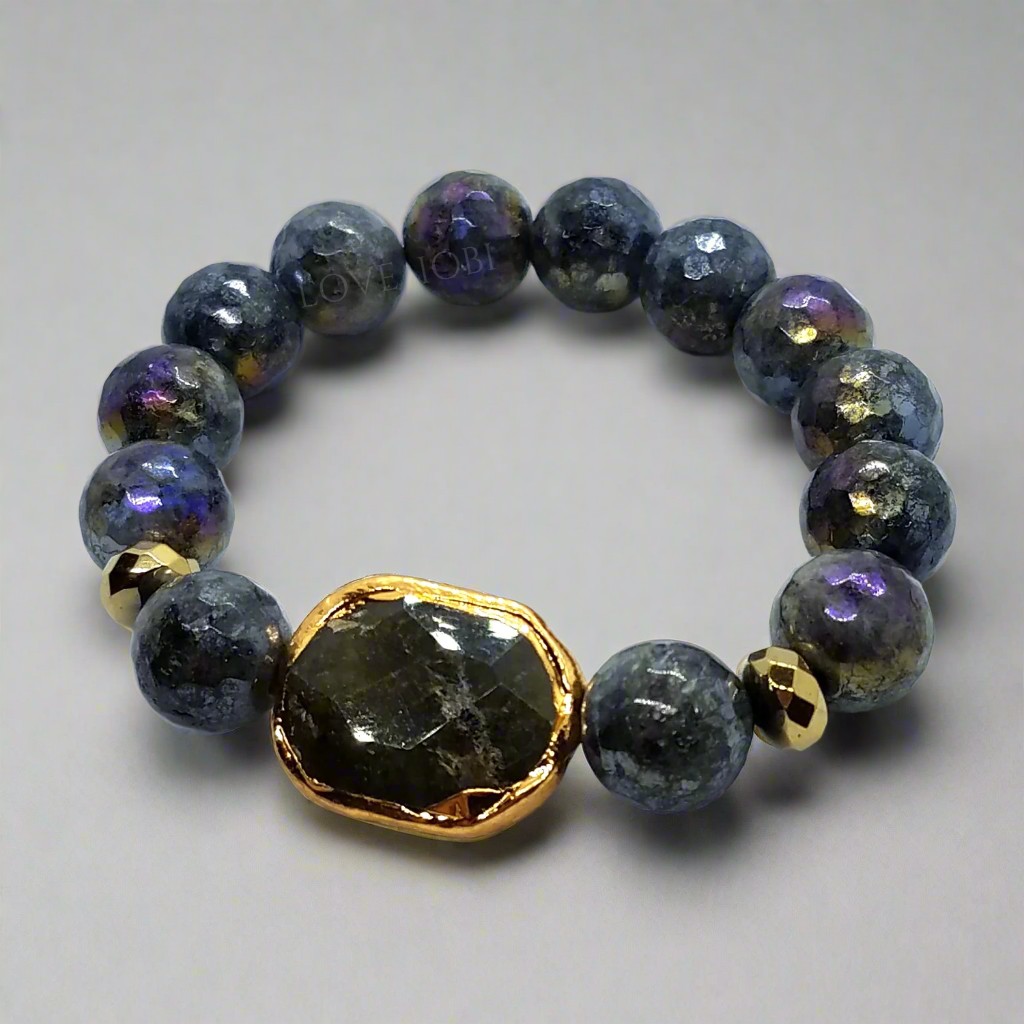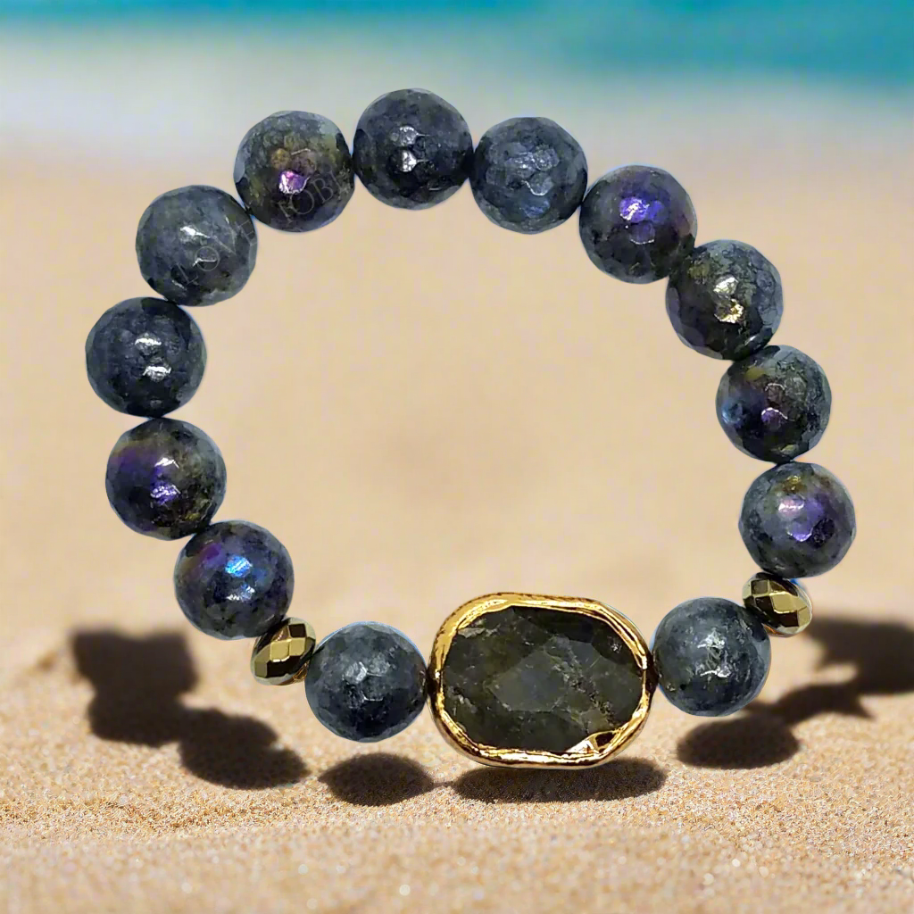 Full of magic and curiosity, Labradorite is dark gray in its base, but when it catches the light, flashes of iridescent color appear. The individual beads are micro faceted to create incredible shine on the surface of the gemstones. The centerpiece is a flat faceted briolette with gold electroplated edging. Coordinating faceted spacers add contrast and shine. Strung on a strong stretch cord it is smooth and comfortable. Genuine gemstones are created deep within the earth. Each is hand cut and faceted to showcase the rich colors. Each is one of a kind and no two are exactly the same. An incredibly unique jewel for the discerning collector.