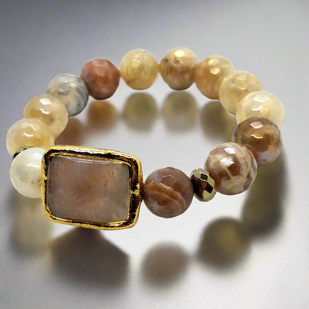 Peach Moonstone is alive with pearly iridescence. The individual beads are micro faceted to create incredible shine on the surface of the gemstones. The centerpiece is a flat faceted briolette with gold electroplated edging. Coordinating faceted spacers add contrast and shine. Strung on a strong stretch cord it is smooth and comfortable. Genuine gemstones are created deep within the earth. Each is hand cut and faceted to showcase the rich colors. Each is one of a kind and no two are exactly the same. An incredibly unique jewel for the discerning collector.