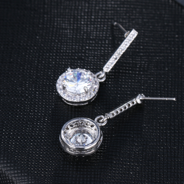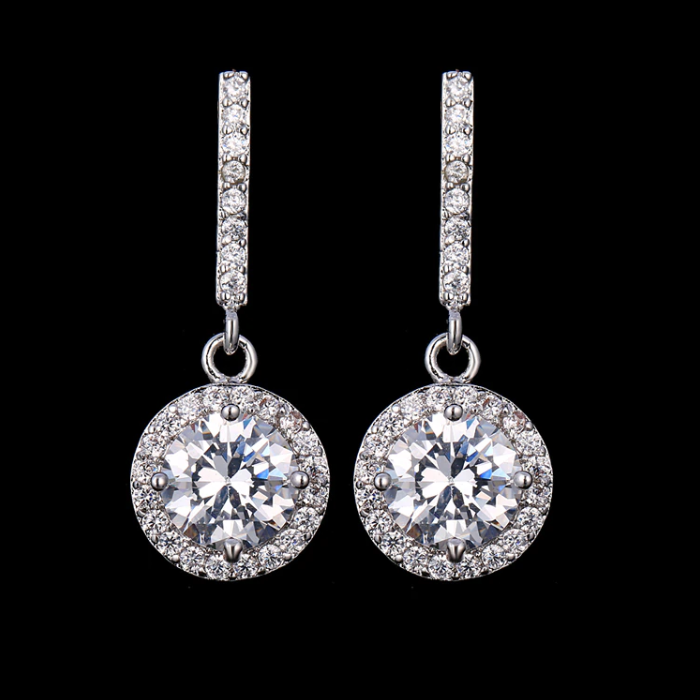 An incredible round cut 1ct, 8mm AAA Zirconia is nestled inside of a gleaming halo of stones making it seem even larger. Each spectacular halo swings from a smooth 18k white gold plated bar channel allowing for movement and even more sparkle with each turn.