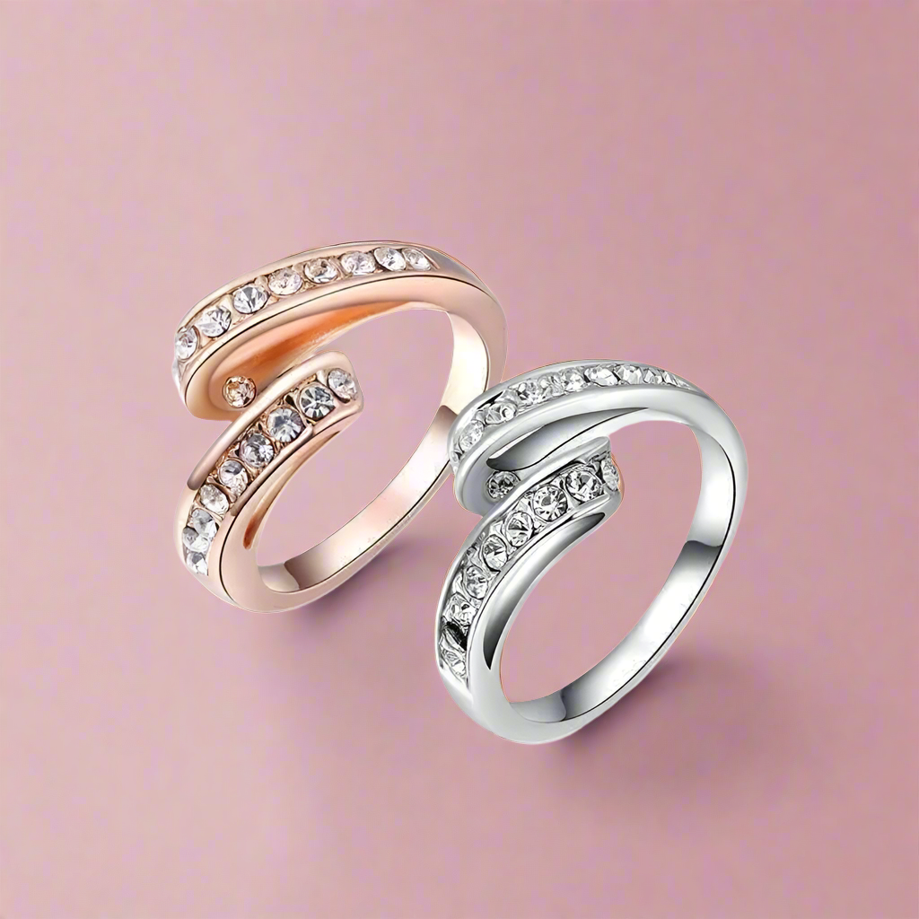 Party Streamer Ring features 18k White or Rose gold plated band (3 times plated for added quality) with a 3-dimensional looped ribbon streamer effect. Channel set genuine Austrian crystal stones are set throughout the top of the ring for amazing sparkle. A beautiful, unique band!