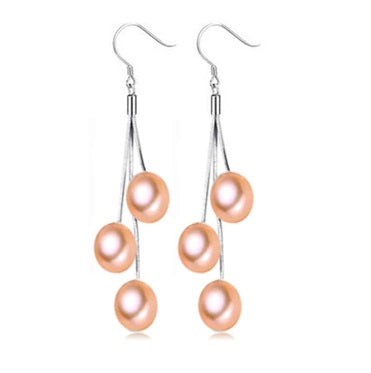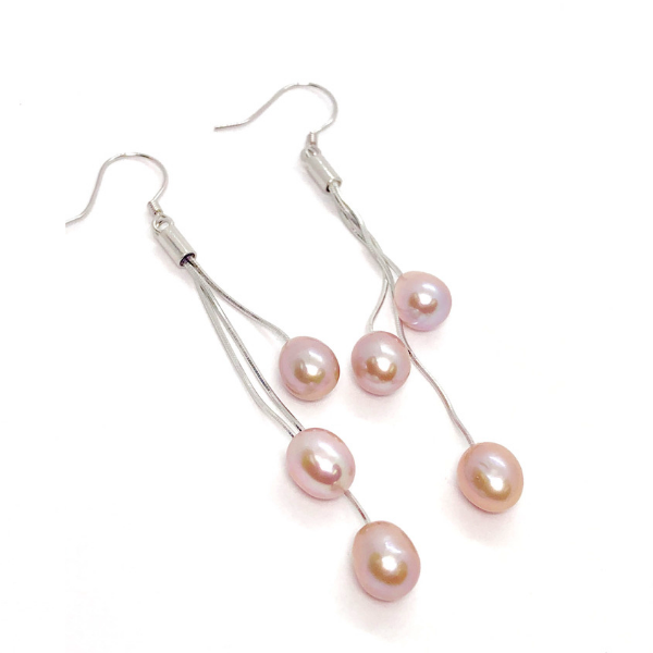 This delicate and unique new style of earrings features three genuine freshwater pearls dangling at alternating lengths on silky smooth sterling silver chains. They dangle gracefully from solid sterling silver hooks. Pair it with our matching Peach Triple Freshwater Pearl Sterling Silver Tassel Necklace