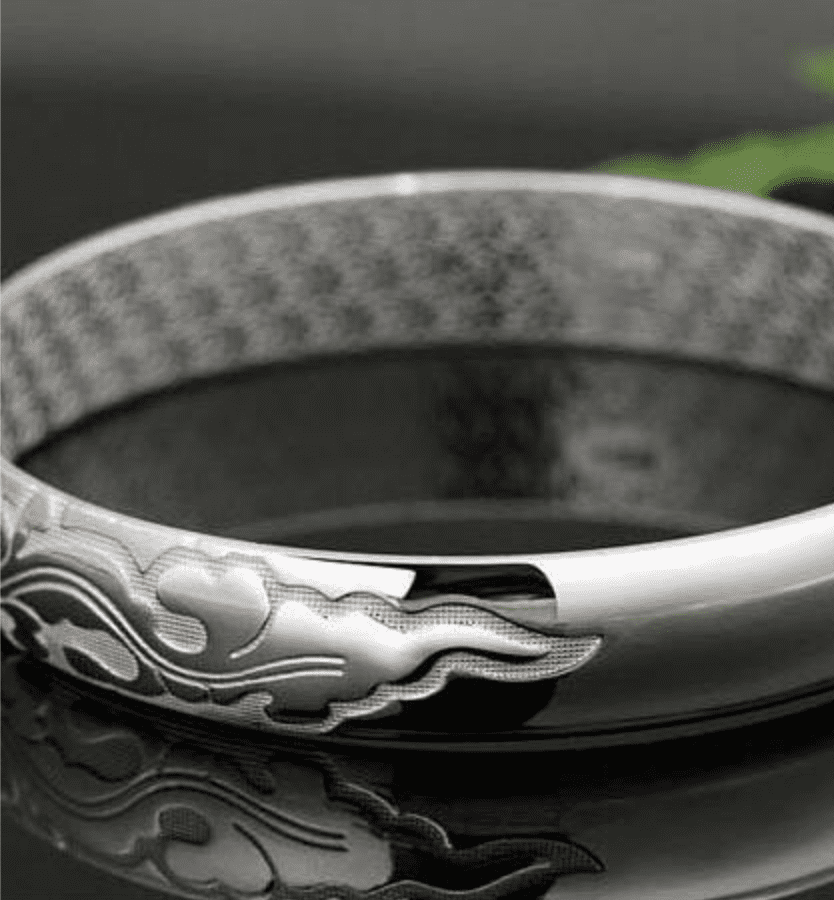 A fancy silver bangle to be sure. A highly polished silver bangle is carved with floral scroll detail. Textured panels add contrast and texture. Pure, understated elegance. Slightly adjustable. A great gift for a girl or woman of any age.