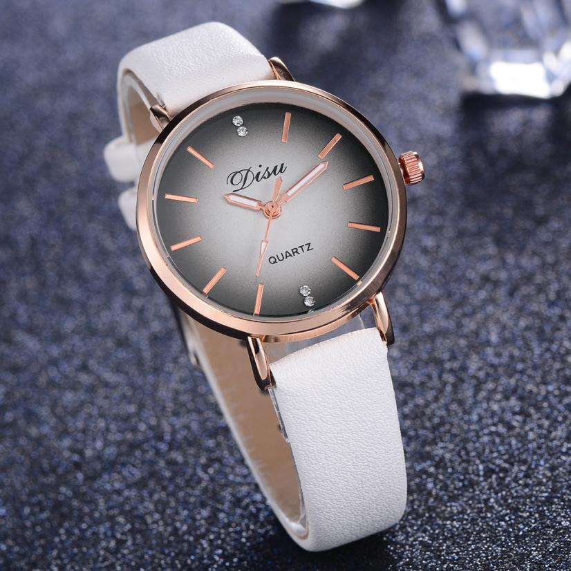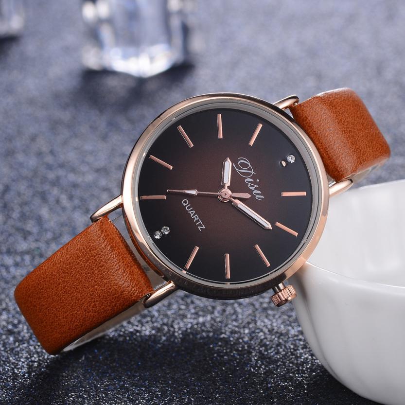 Subtle and elegant. This watch features a face with colors fading from black on the edge to the color of the band inside. The hour marks are accented by 2 crystals at 12 and 6. The rose gold case and hands add to the richness of the design.