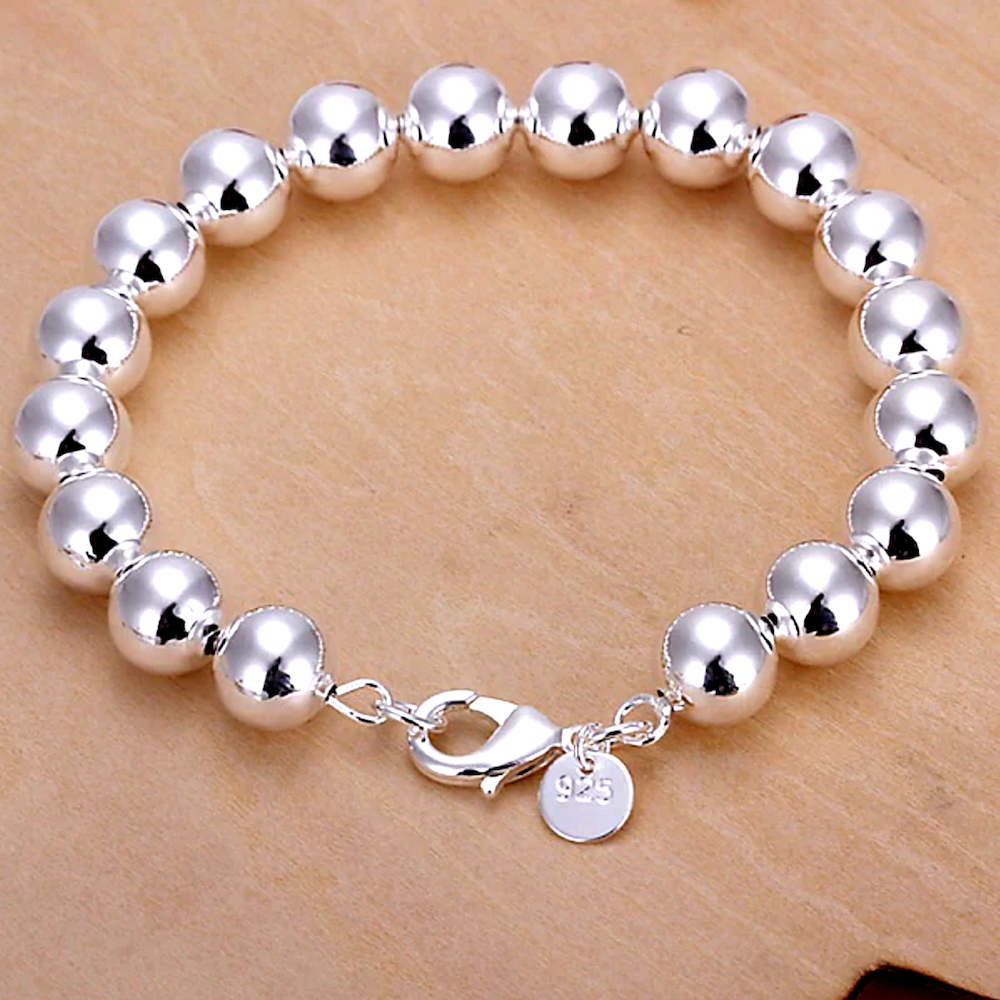 Classic, sophisticated elegance! This bracelet features a row of 10mm high polished silver beads that come together with a lobster claw closure. This bracelet is bold and beautiful without being overpowering. The smooth beads are comfortable and easy to wear all day, every day. Perfect for any occasion: conservative enough for work, dress it down with your jeans, or wear with your dressy outfits of any color. This timeless bracelet will compliment your entire silver jewelry collection.