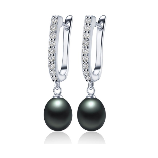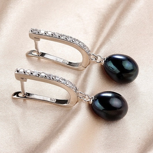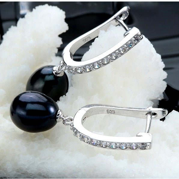 The hottest new trend in pearls is exotic black south sea style pearls. These highly lustrous drop pearls iridesce with shades of blue, black and green. A delicate and unique new style of earring showcase a single black genuine freshwater pearl dangling from a brilliant line of bright white CZ stones.