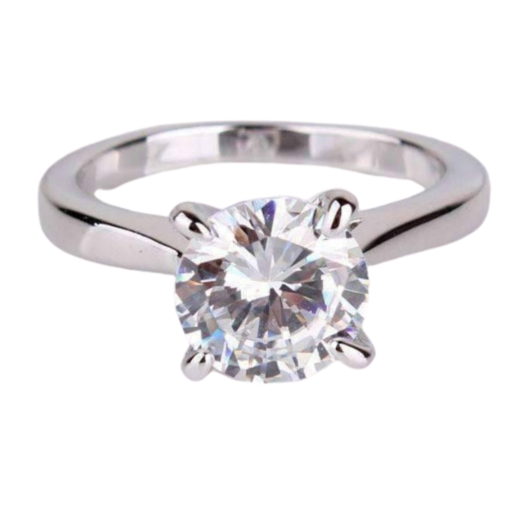 A stunning 8mm white cubic zirconia solitaire sparkles atop this classic cathedral set engagement ring. Simple, yet impressive. A perfect accompaniment for an heirloom band or stack with other rings for fun.