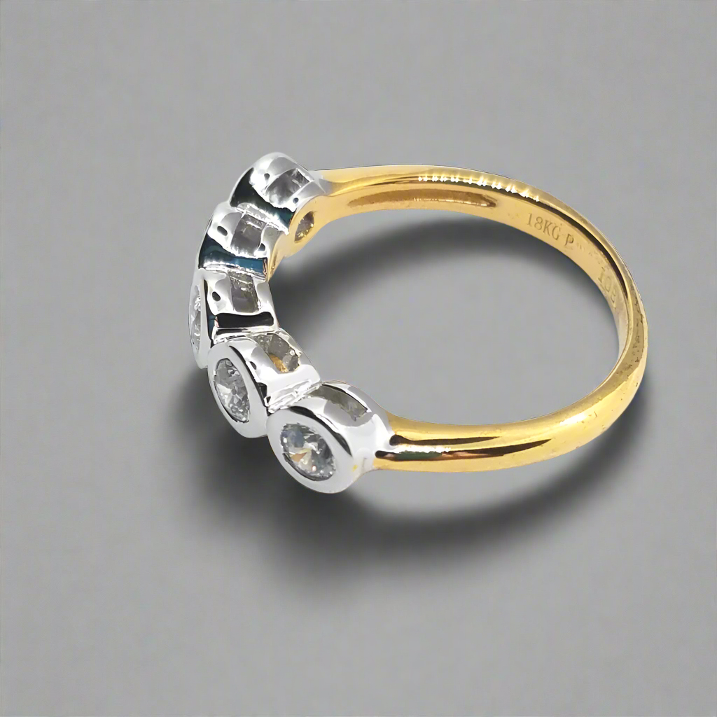 The bezel is a most popular style of setting. Surrounding the brilliant stones in the precious metals it creates a sleek modern effect. Smooth to the touch and most secure. Each stone is 3.7mm (.20CT) totaling 1CTW. This impressive OB Simulated Diamond designer setting is crafted in 18K gold plating over solid 925 sterling silver that contrasts with the bright silver bezels.